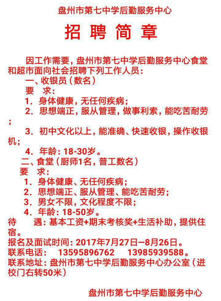 盤州市第七中學(xué)后勤服務(wù)中心招聘簡章