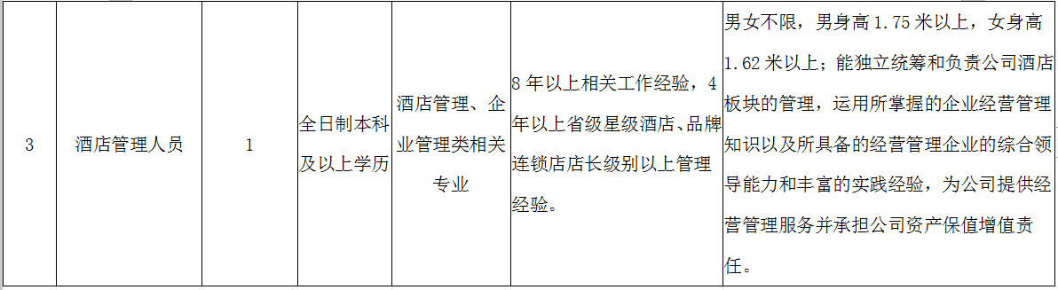營銷管理人員1名、景區(qū)管理人員1名、酒店管理人員1名、建筑管理人員1名,詳情見附件2。