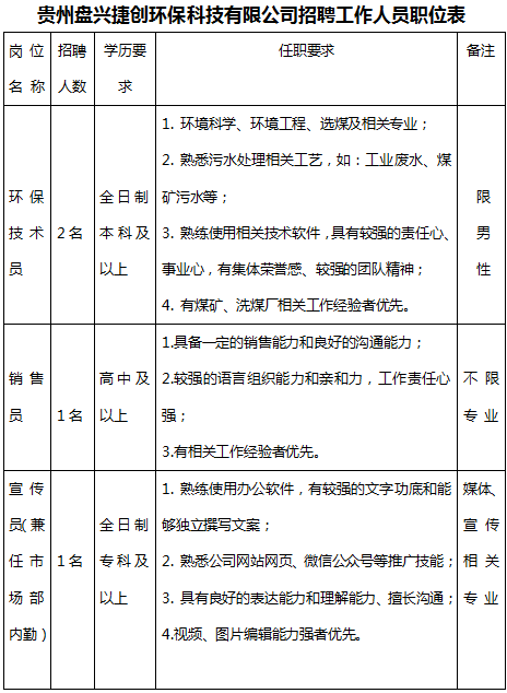 貴州盤興捷創(chuàng)環(huán)?萍加邢薰2021年面向社會公開招聘環(huán)保技術員2名,銷售員1名,宣傳員(兼任市場部內(nèi)勤)1名。具體招聘職位詳見《貴州盤興捷創(chuàng)環(huán)?萍加邢薰菊衅腹ぷ魅藛T職位表》